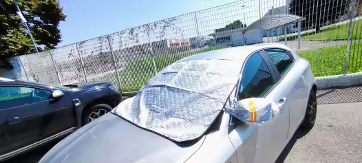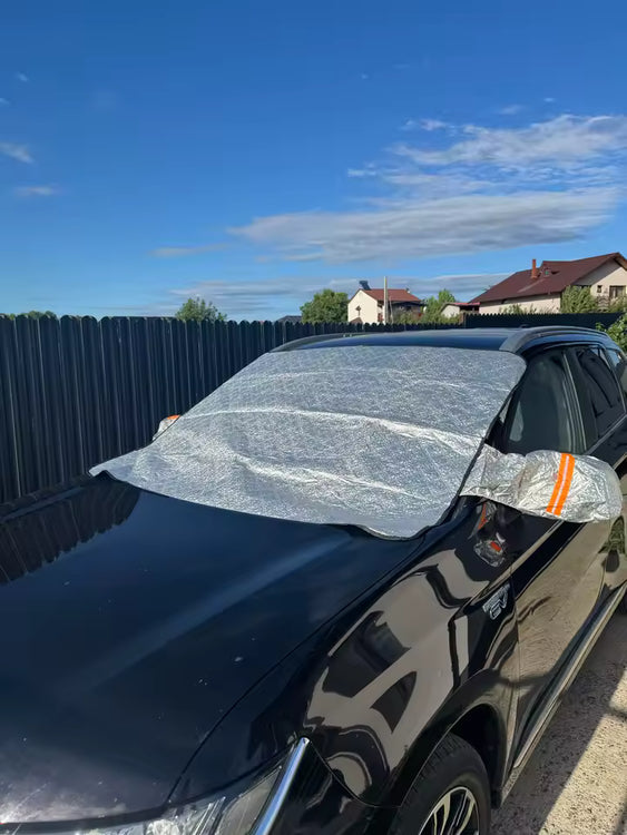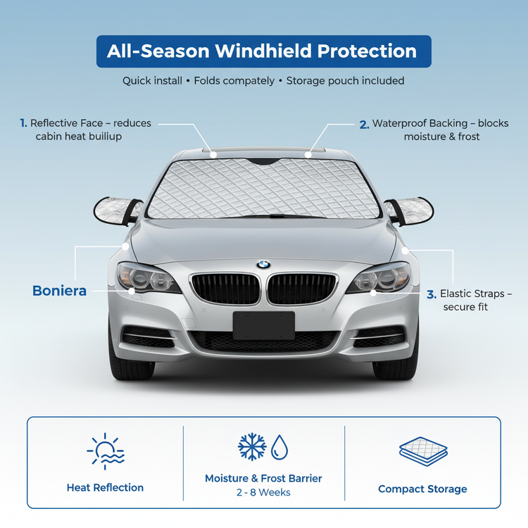 Reflective face reduces heat buildup, waterproof backing blocks moisture and frost, and elastic straps ensure a snug fit over side mirrors. Folds compactly for easy storage in the included pouch.